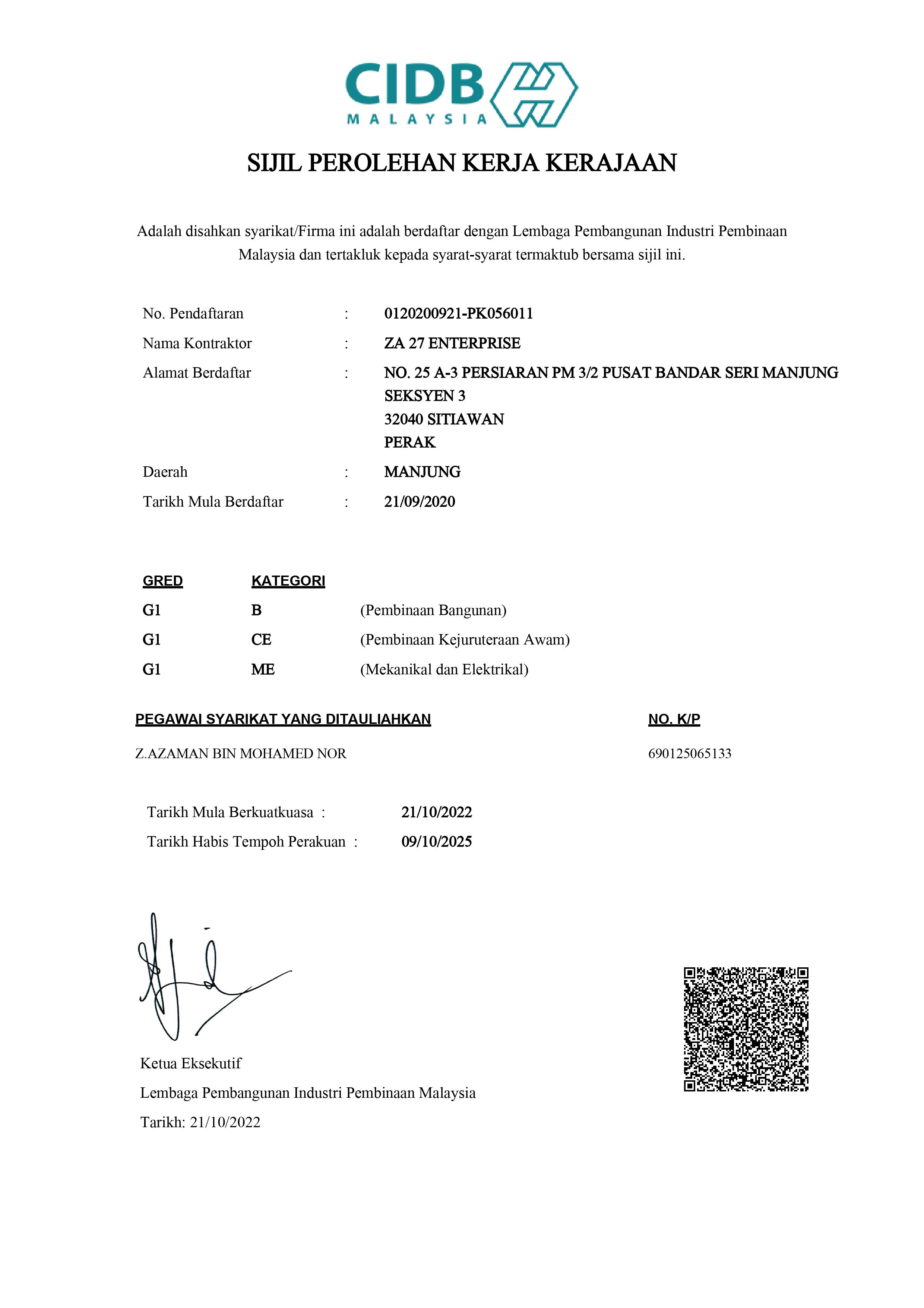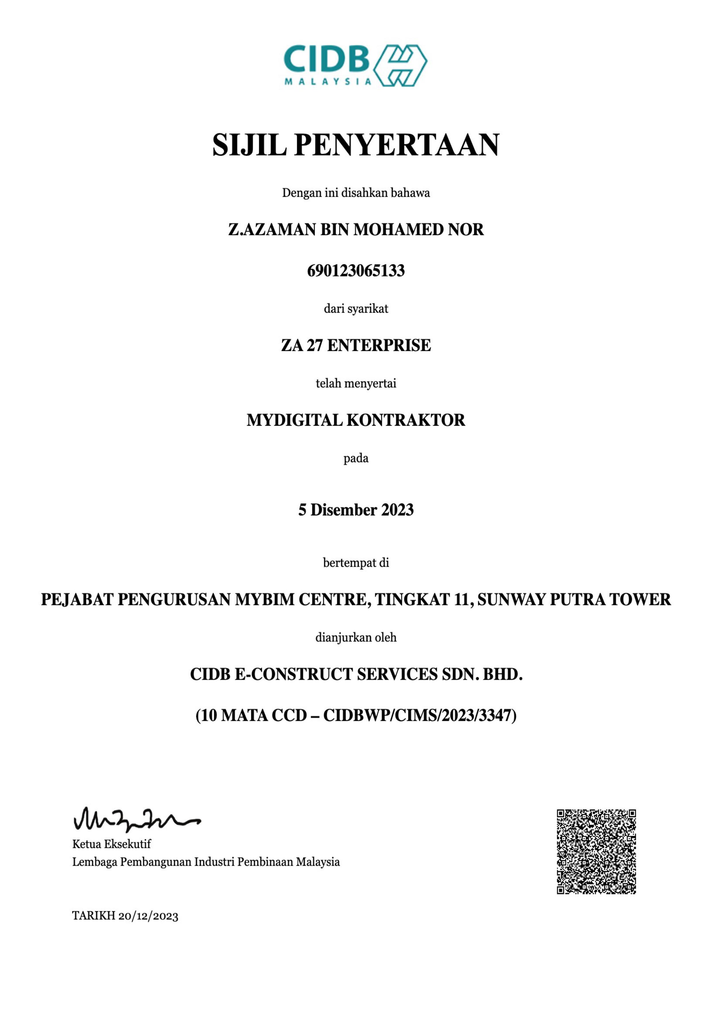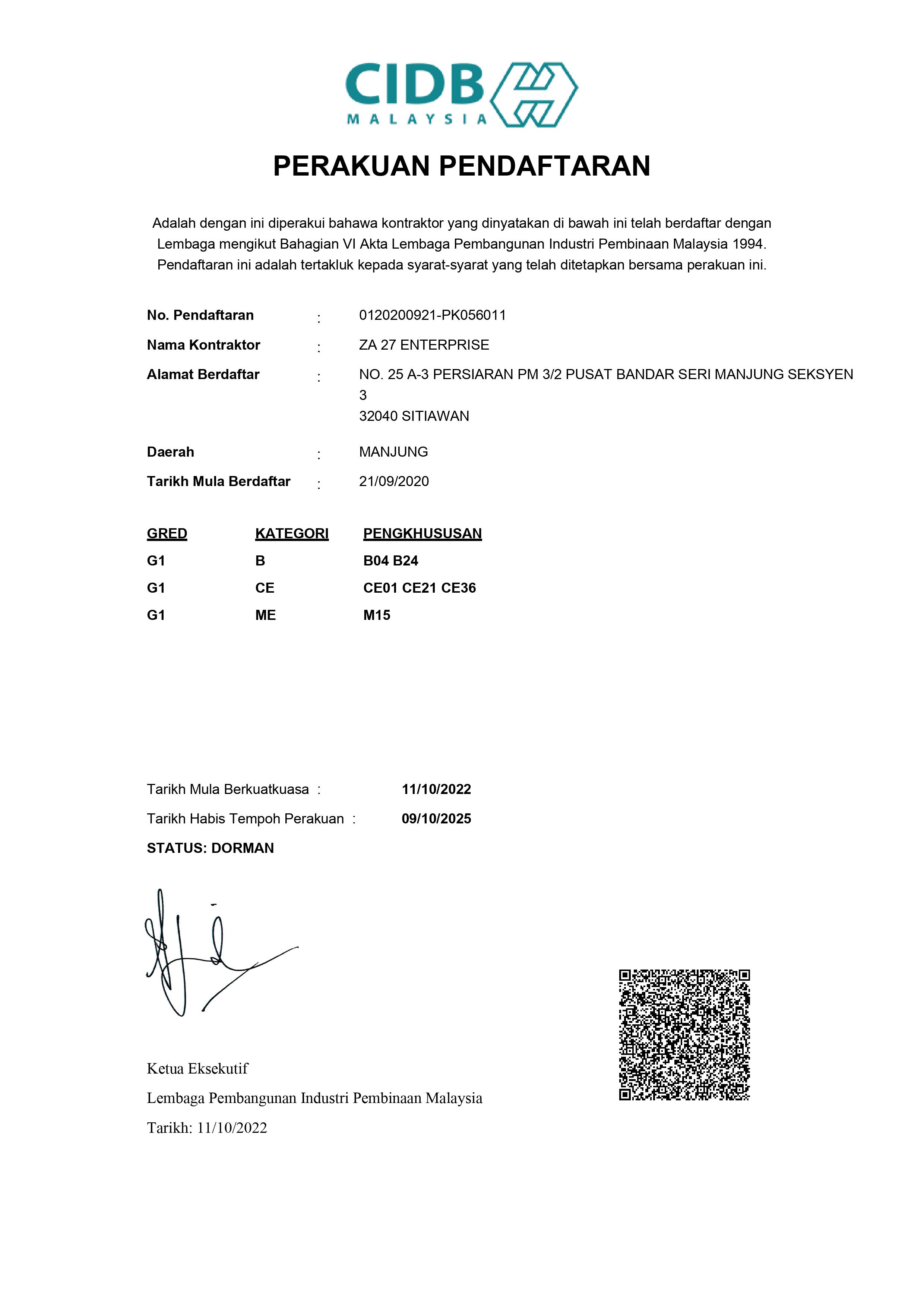 ZA 27 ENTERPRISE is a dynamic and forward-thinking construction and engineering firm founded by Mr. Z. Azaman Bin Mohamed Nor. Established with a commitment to excellence, innovation, and client satisfaction, the company has rapidly emerged as a prominent player in the construction industry. Specializing in Grade 1 building construction, civil engineering, and mechanical & electrical engineering, ZA 27 ENTERPRISE boasts comprehensive proficiency across various disciplines. From the meticulous construction of buildings and pavements to civil engineering projects and diverse mechanical installations, the company's expertise covers a broad spectrum. This versatility positions ZA 27 ENTERPRISE as a reliable and dynamic player in the industry, with a solid foundation built on a client-centric approach and a vision for setting new standards in construction and engineering.